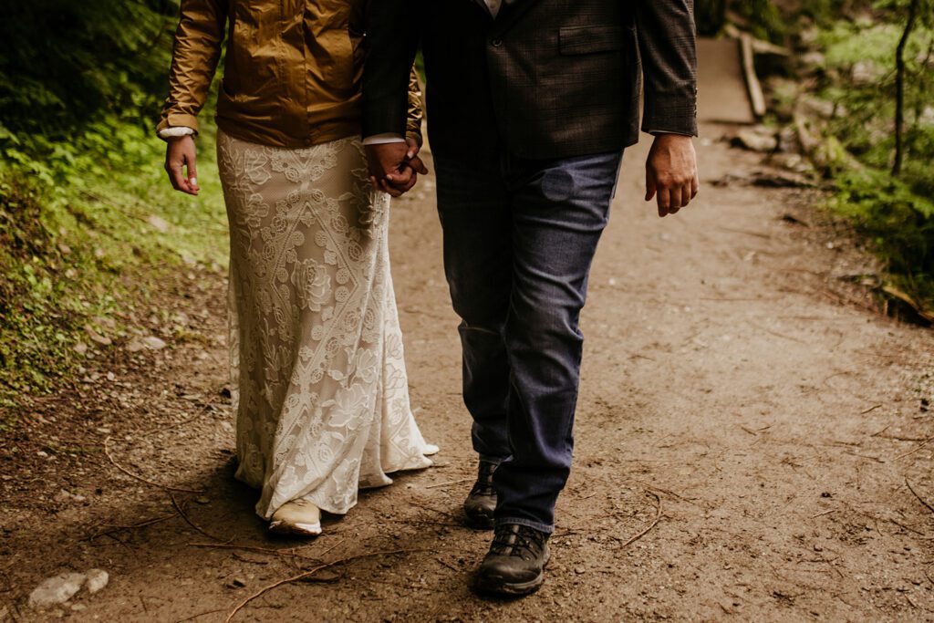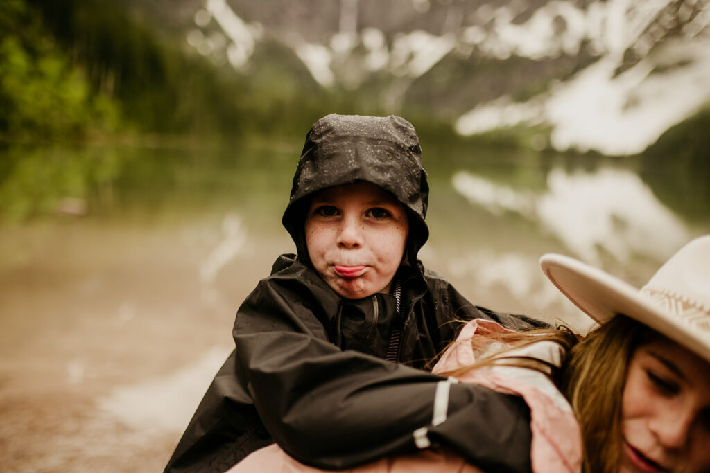 The rain picked up for a bit, but the family only slowed down for snacks. A staple item that we included on The Ultimate Adventure Elopement Guide. Towards the top we saw blue jays above and chipmunks beside us. Welcoming us to their land. With snow on the mountains, the reflections on the lake were nothing short of magical. Maggie and James giggled sweetly with each other, sharing their affection. They made their own moments, two stepping by the lake just as they do in their kitchen at home in Texas. After taking full advantage of photographing the beauty above, it was time to hike down to the ceremony.