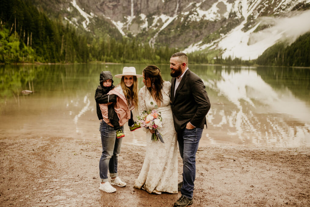 Maggie grew up in the Sierra Nevada mountains, inspiring her love for all things mountaintop. When James proposed in beautiful Wyoming everything felt right. Together, it seemed fitting to plan an adventurous outdoor elopement. The cherry on top of the plan- Glacier has been on her ultimate mountain bucket list. A husband and a dream mountain? Check, check! Pro tip – learn how to elope in glacier national park with our guide. Maggie and James were ready to make their elopement a fun experience for themselves and their two kids – Evie and Ridge.
