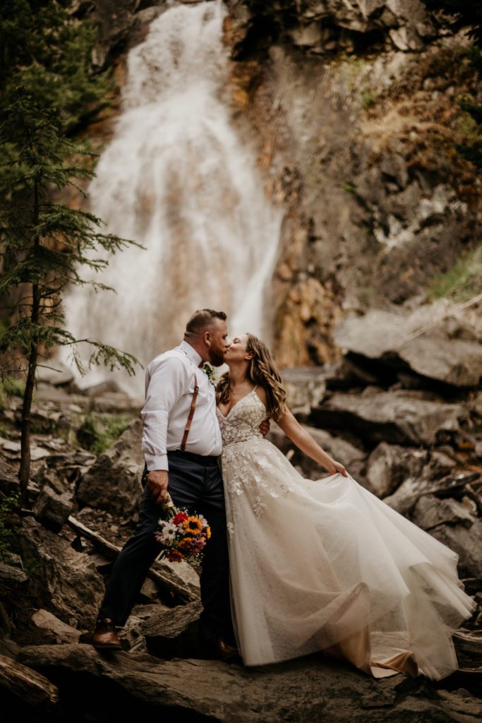 We approached Holland Falls, overlooking Holland Lake, with Mission Mountains in the background. Alpenglow was happening so the mountains were getting really pink. A cotton candy paradise. We reached the top right before the sun crested the hill. MAGIC! Their ceremony spot was nestled at the top with a mountain lookout. Lindsay changed into this gorgeous wedding dress. The top was feminine with the rest of the gown flowing around her. Vance jumped into a suspender groom outfit, paired with a maroon bow tie. They were the raddest looking pair ever and their micro wedding was a 100% adventure.