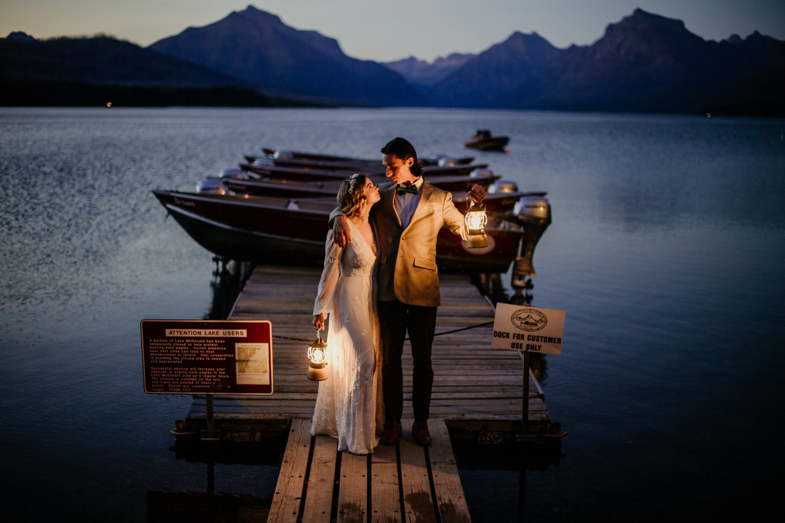 We take them up the Going to the Sun Road to our favorite spots in the park. I mean, we just LOVE spoiling these two! Sunset fades and we go to the tip of Lake McDonald for some oh-so moody lantern photos. Just because the sun has gone behind the mountains, doesn’t mean we’re still not having a BLAST! Every Glacier National Park micro wedding should have these romantic lantern photos, but we’re biased.